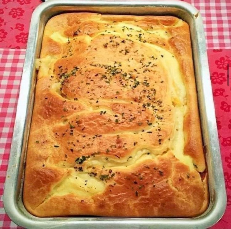 - Espalhe o recheio de frango e cubra com o restante da massa.