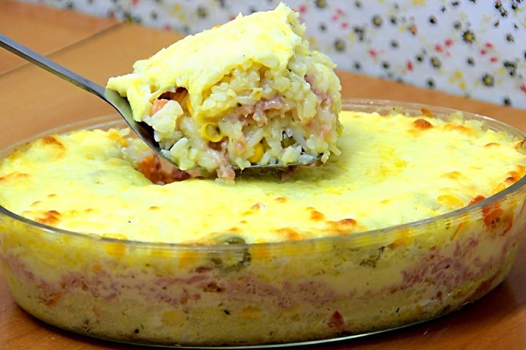O preparo do almoço em 3 minutos é super simples, é só misturar tudo e levar ao forno, não tem erro! Para começar, vamos precisar de arroz já cozido, então pode fazer na hora ou então reaproveitar aquele arroz que sobrou da refeição passada. Vamos colocar o arroz em um recipiente, adicionar alguns ovos e misturar bem. Na sequência, entramos com cebola, tomate, azeitonas e alguns temperos e misturamos novamente. Agora vamos montar em uma travessa refratária, e para isso fazemos uma camada de arroz, uma de presunto, uma de muçarela e mais uma de arroz e outra de muçarela. Com tudo montado, é só levar o almoço em 3 minutos ao forno para finalizar!