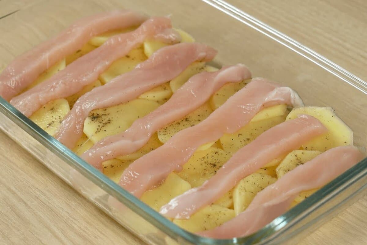 - Adicione num refratário, um pouco de óleo ou azeite e distribua com um pincel. Monte no fundo dele, uma camada com cerca da metade das batatas, polvilhe um pouco de pimenta-do-reino a gosto, cubra com as tiras de frango, seguidas da cebola, monte mais uma camada com o que sobrou das batatas, derrame o creme sobre tudo, distribuindo a muçarela ralada por cima.
