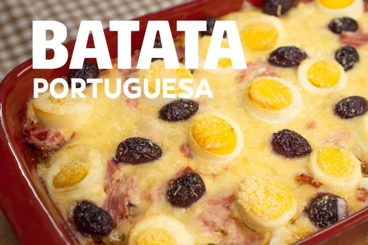 Para fazer essa batata portuguesa, precisaremos de ingredientes comuns, como batata, cebola, azeite, manteiga, farinha de trigo, leite, queijo parmesão ralado, presunto, queijo muçarela, ovo, azeitona preta, louro, noz-moscada, pimenta-do-reino, e sal. O modo de preparo dessa batata portuguesa é muito fácil! Primeiro, cortamos as batatas em rodelas e cozinhamos em água por 7 minutos na fervura. Preparamos a cebola caramelizada e o molho branco e, em um refratário, colocamos batatas, molho branco, cebola caramelizada, presunto, muçarela, ovo e azeitonas. Assamos por 30 minutos e depois provamos essa iguaria!