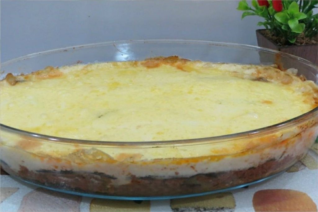 - Em um refratário, alterne camadas de berinjela e carne moída, finalizando com o molho branco.