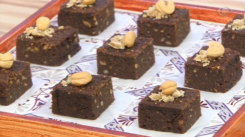 Apesar de ser um bolo de mandioca, ele é feito para se parecer com um pé de moleque, mas, em vez de amendoim, ele leva castanha de caju.