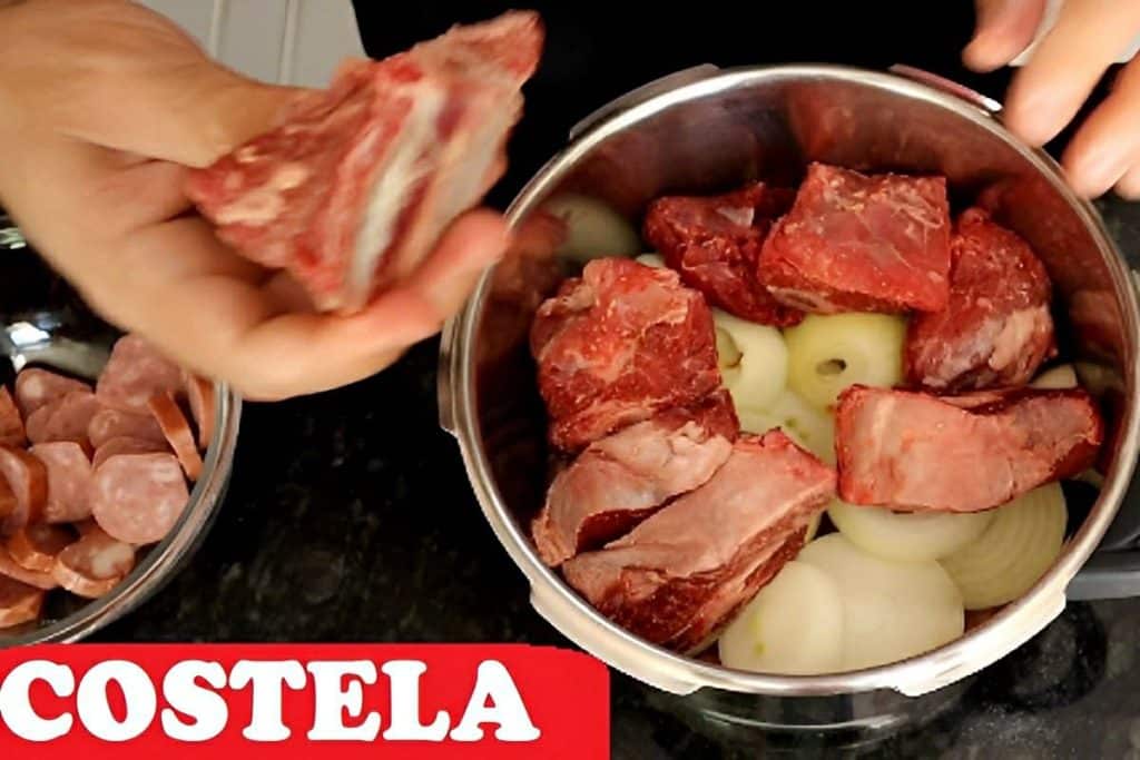 Essa receita é especial porque tem um diferencial muito importante: não vamos adicionar água na panela para cozinhar a costela. Vamos cozinhar a carne na panela de pressão junto com cebola e calabresa, e o que vai cozinhar a carne é a água da cebola, o que vai conferir ao nosso preparo um sabor muito especial. Para fazer isso, vamos dispor em camadas em uma panela de pressão a cebola, cortada em rodelas bem grossas, a costela em pedaços e linguiça calabresa cortada em rodelas. Depois de fazer todas essas camadas, é só levar ao fogo de médio a baixo e cozinhar na pressão por alguns minutos!