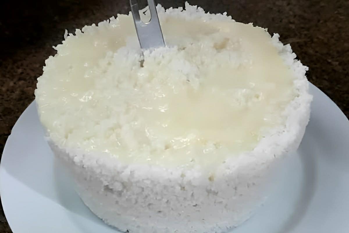 - Desligue o fogo e desgrude as bordas, retire da cuscuzeira e finalize com leite condensado e coco.