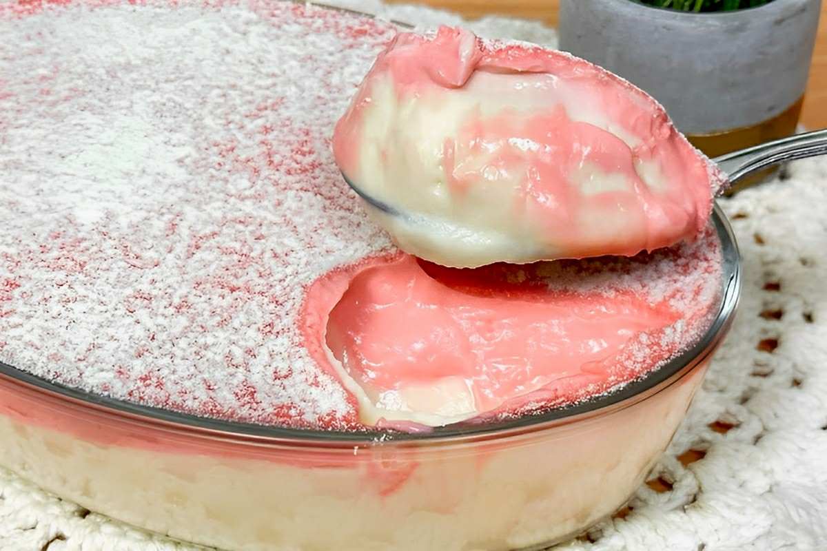 - Num refratário, despeje o creme branco, em seguida coloque o creme de morango por cima. Leve para gelar por 3 horas. Retire da geladeira e polvilhe leite em pó a gosto.