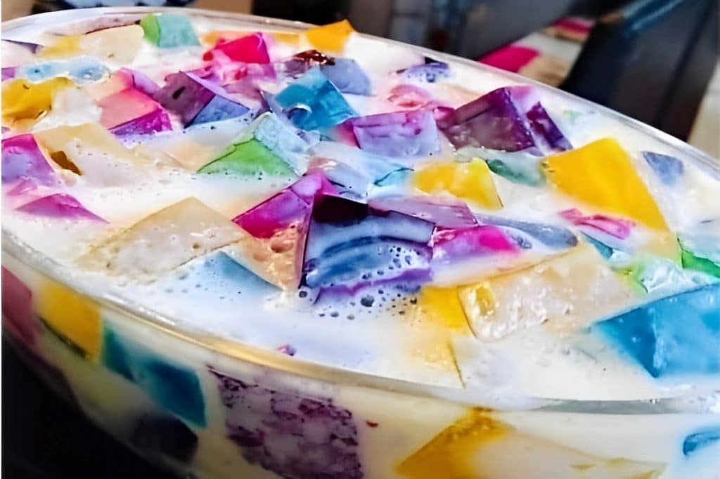 - Com uma espátula ou colher, mexa delicadamente para que os cubos de gelatinas se misturem tornando tudo bem colorido. Leve para gelar por cerca de 2 horas.