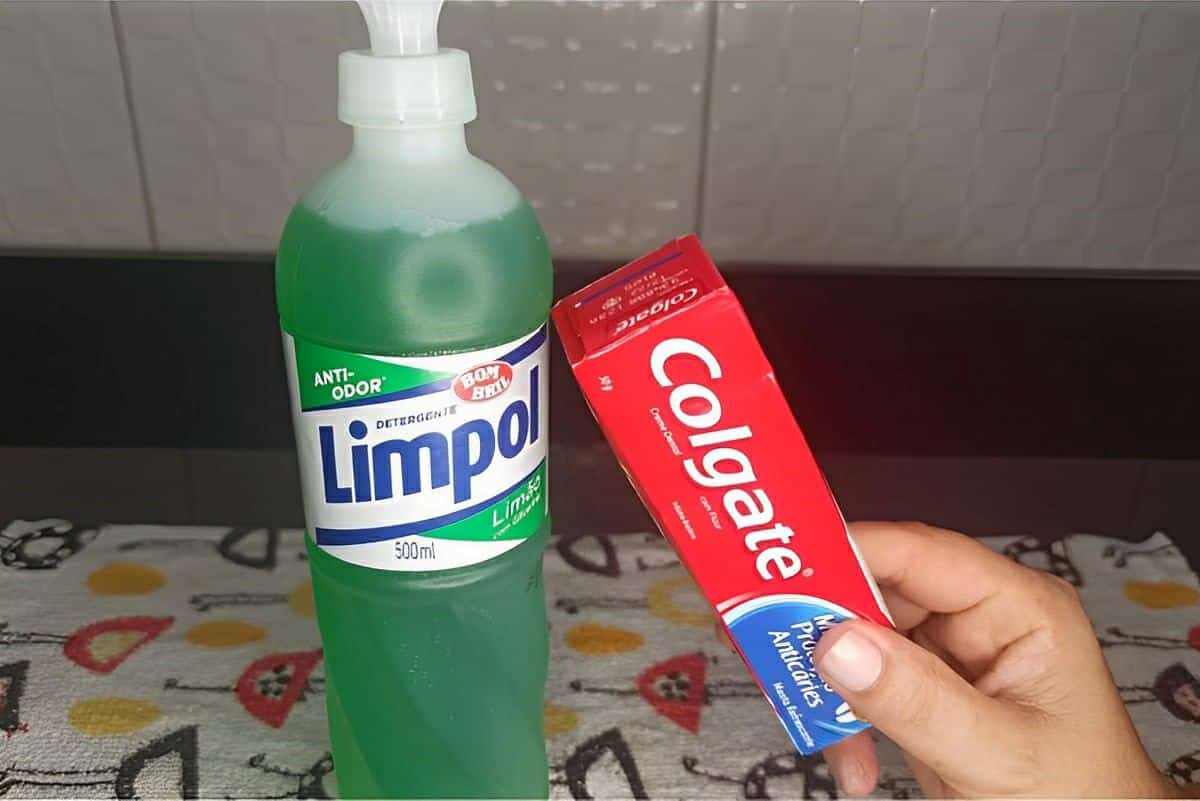 - Em uma tigela, coloque o detergente, o creme dental, a água e o bicarbonato de sódio.