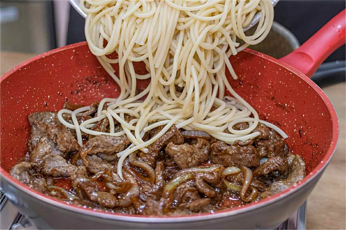 - Junte o bife, misture para agregar e deixe aquecer um pouco mais. Por último coloque o macarrão e mexa bem para envolver todos os ingredientes.