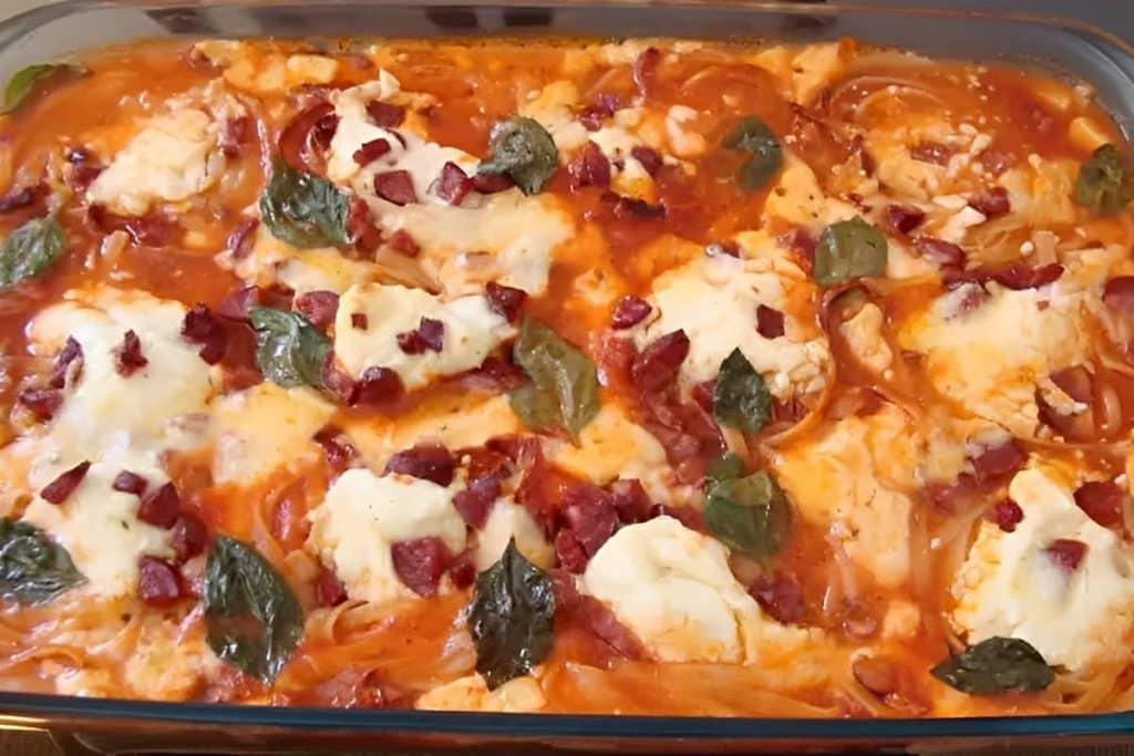 Para fazer esse macarrão ao forno vamos precisar de ingredientes que você deve ter em casa como macarrão talharim, requeijão cremoso, molho de tomate, presunto, queijo muçarela, caldo de galinha em cubos, água, e sal. O modo de preparo é simples: colocamos a água para ferver com sal e o caldo de galinha. Forramos um refratário com molho de tomate, dispomos os talharins, recheamos com requeijão, salpicamos o presunto e a muçarela sobre o macarrão, despejamos a água fervente e assamos por 25 minutos. Depois é só esfriar e provar essa delícia!