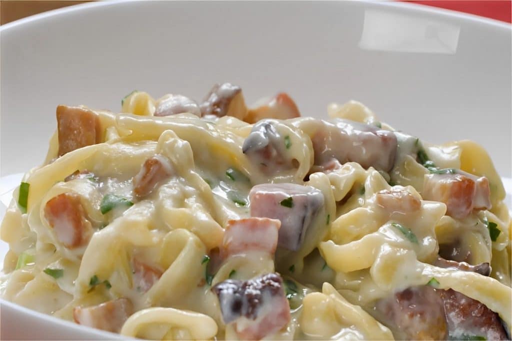 Para esta receita, vamos fazer um molho branco com manteiga ou margarina, farinha de trigo, leite, requeijão, sal, noz-moscada e creme de leite. Em seguida, vamos fritar o bacon até ele ficar dourado. Para finalizar, vamos misturar o molho branco e o bacon frito ao macarrão cozido e serviremos essa delícia de macarrão com molho branco. Com certeza, toda a família vai adorar!