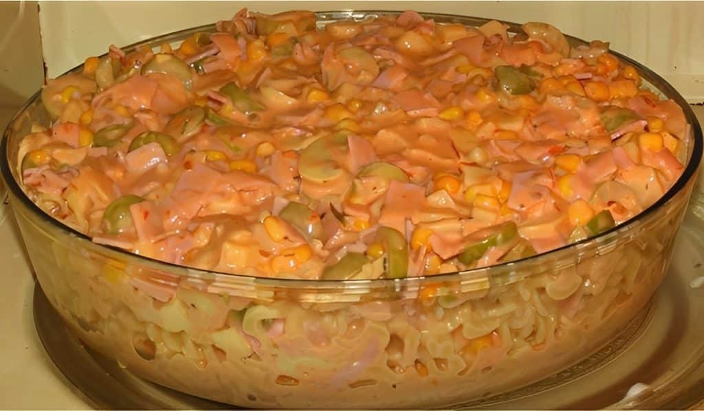 O macarrão com tudo dentro é feito com macarrão parafuso, queijo e presunto e um molho com extrato de tomate, azeitonas, milho e creme de leite.