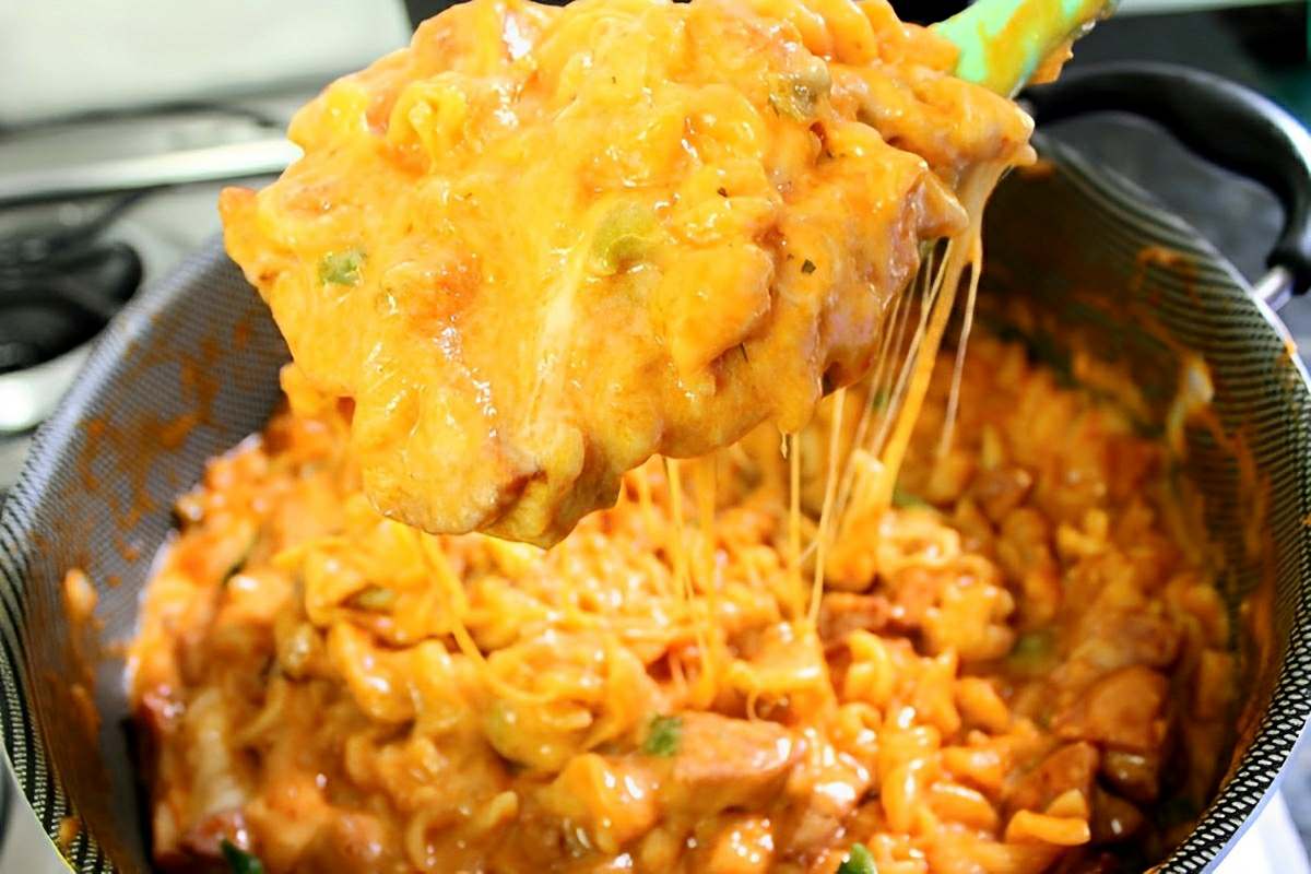 - Apague o fogo, ponha um copo de requeijão cremoso e mexa bem, juntando também a muçarela ralada e misturando.