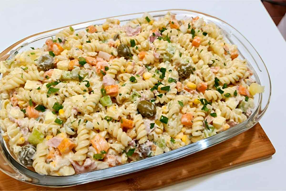 Para o macarrão cremoso, iniciaremos pelo cozimento do macarrão, numa panela com água fervente e sal. Numa bacia, adicione as batatas, as cenouras, os tomates, o milho-verde, a cebola, as azeitonas e cheiro-verde. Utilizaremos: orégano, pimenta-do-reino e sal para temperar, mexendo super bem. Apagaremos o fogo do macarrão estando cozido, iremos escorrer e deixar reservado, até esfriar. Juntaremos na bacia a muçarela e o presunto, mexendo mais uma vez. Colocaremos o macarrão frio e misturaremos muito bem. Finalizaremos a receita seguindo o passo a passo. Sirva e desfrute de seu maravilhoso macarrão cremoso!