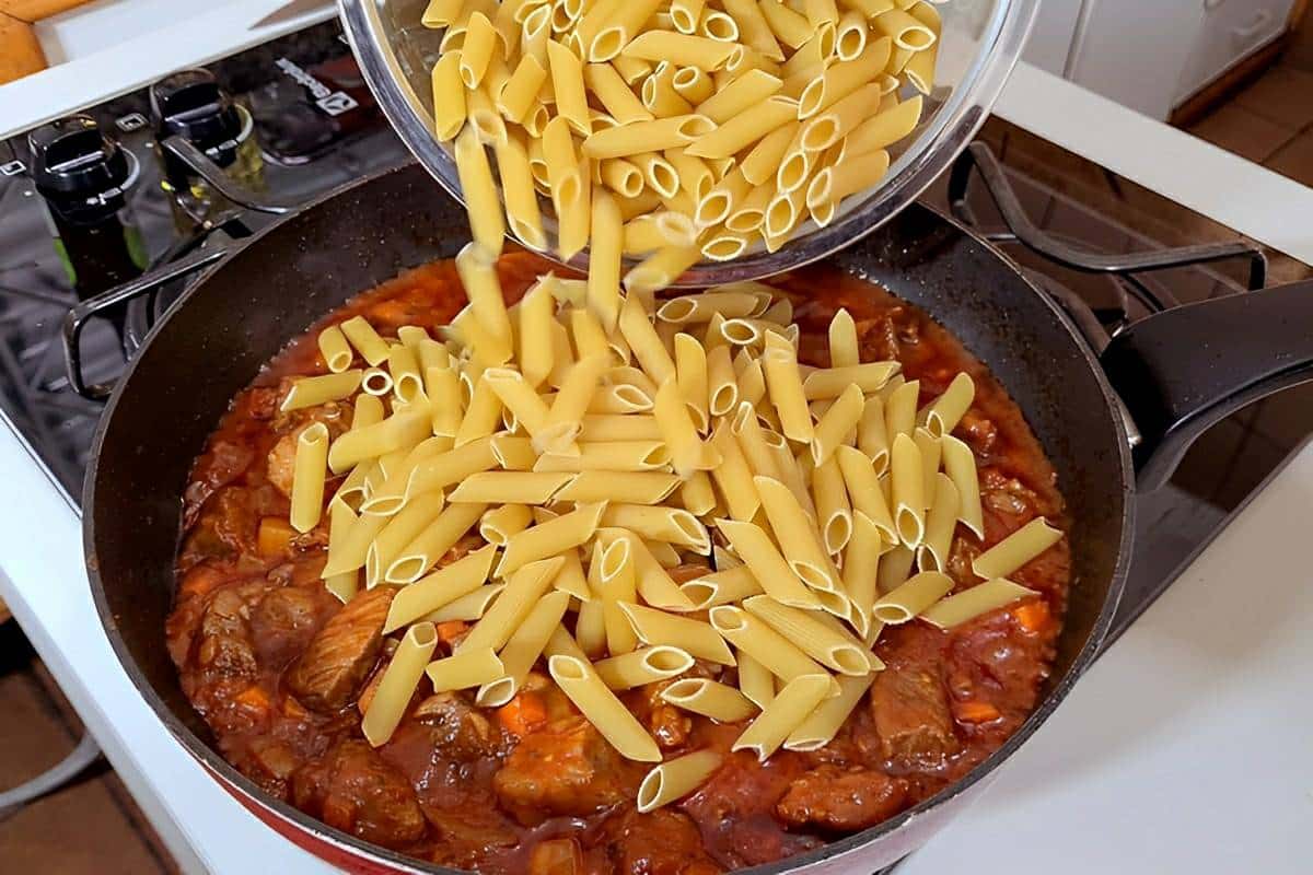 - Quando faltar 5 minutos para finalizar o cozimento, coloque na panela mais 100 ml de água, para garantir que o macarrão fique cozido e não grude no fundo da panela. Mexa, volte a tampar e finalize o cozimento.