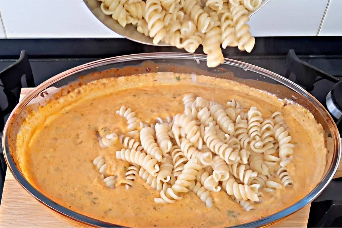 - Passado esse tempo, retire o refratário do forno, misture para uniformizar a cremosidade do molho e adicione o macarrão parafuso cozido, misturando bem.