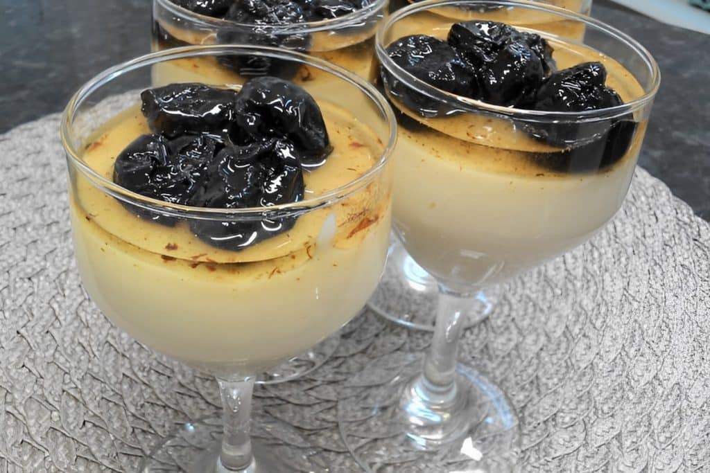 - Coloque a mistura em taças, cubra com a calda de ameixas e leve para gelar por 2 horas.