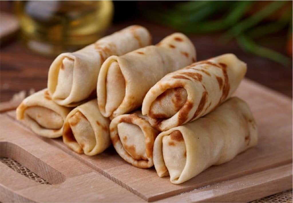- Despeje uma concha de massa de panqueca para fritar em fogo médio, espalhando bem sobre o fundo da frigideira até obter uma camada fina de massa.