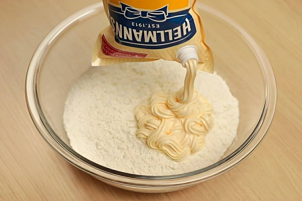 - Em uma tigela, coloque a farinha de trigo, o fermento químico em pó e metade da maionese. Misture bem.