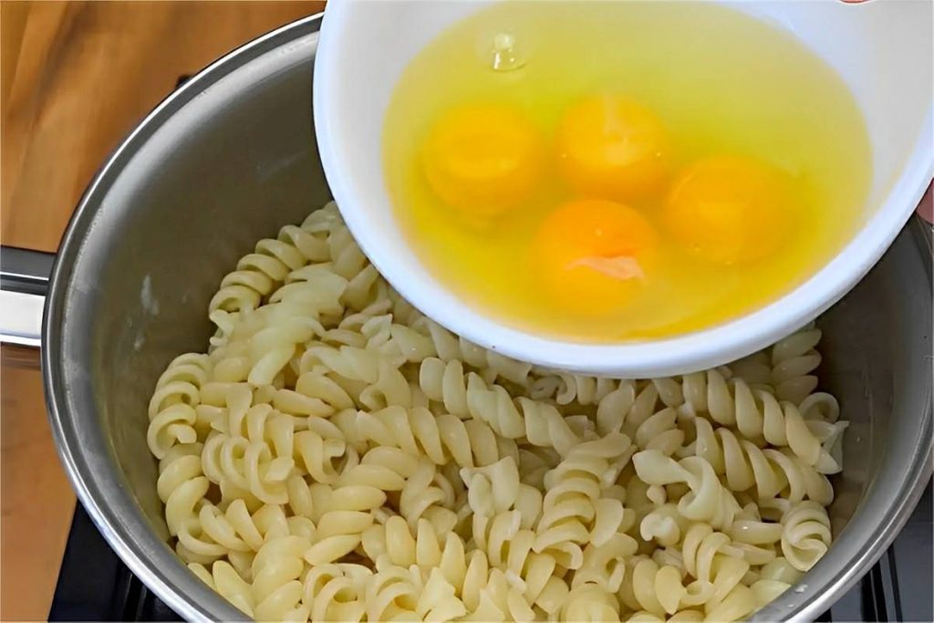 - Na sequência, mexa tudo muito bem. Coloque os ovos e misture bem até que os ovos cozinhem e se forme uma mistura homogênea.