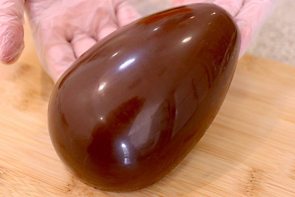 - Retire da geladeira, e para desenformar remova a parte lisa, o silicone e vire a forma sobre a bancada, e o ovo sairá perfeito.