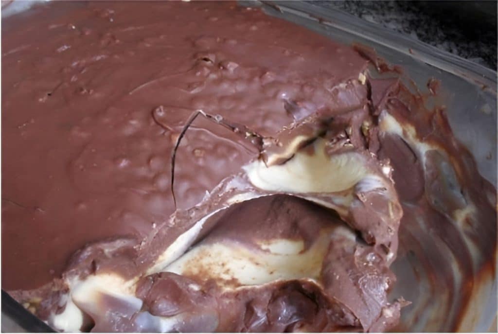 - Por último, derreta o chocolate ao leite em banho-maria ou no microondas, e coloque por cima da sobremesa.
