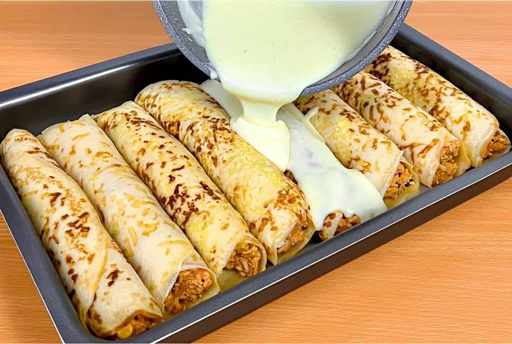 - Espalhe o restante do molho branco sobre as panquecas.