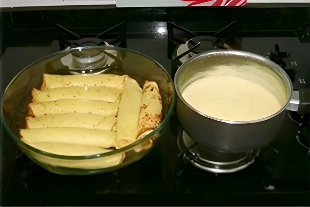 - Forre o fundo de uma travessa com uma camada de molho branco e acomode nessa travessa as panquecas.