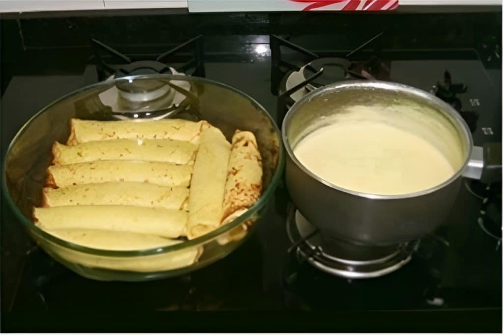 - Ajeite as panquecas enfileiradas no refratário, por cima do molho branco.