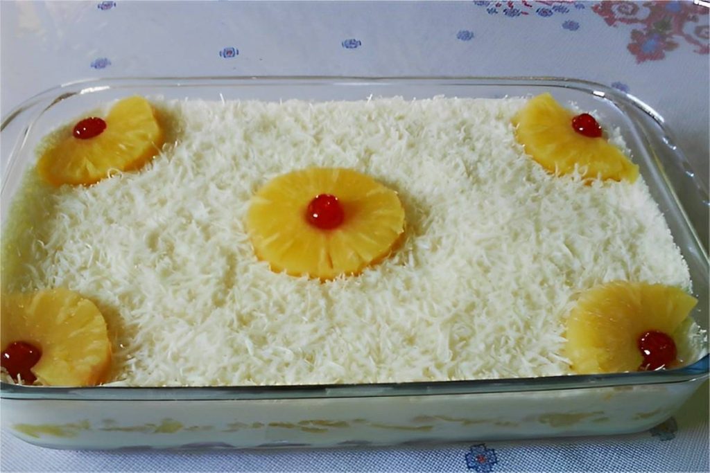- Faça uma camada de creme por cima das bolachas e distribua o abacaxi picado.