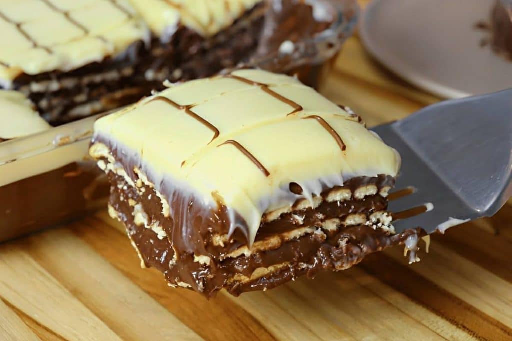 - Num refratário, intercale camadas de creme de chocolate com biscoitos de maisena umedecidos no leite com achocolatado, até terminar os ingredientes.