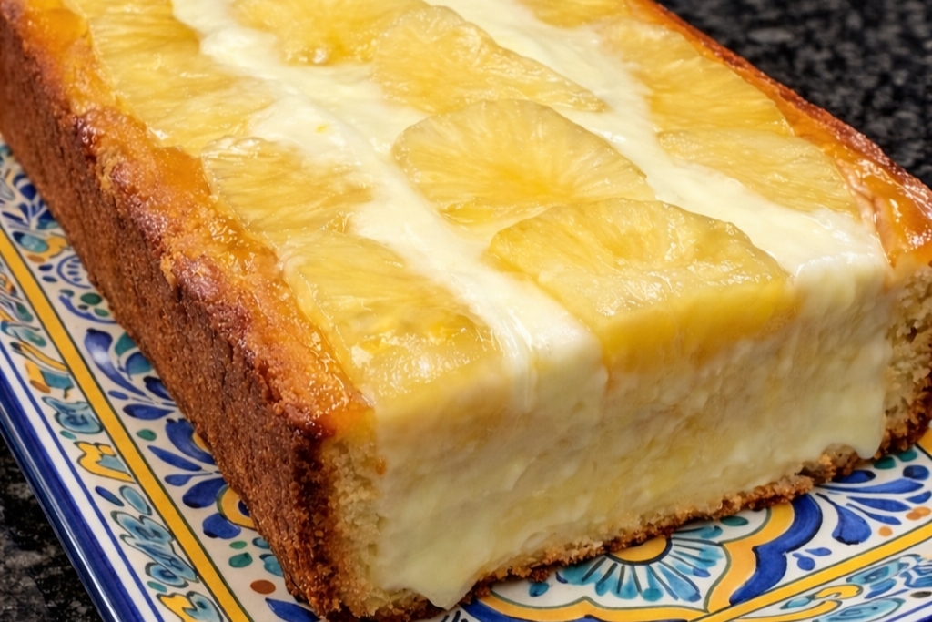 É aquele bolo fofinho, bem amanteigado, com abacaxi por cima e um creme delicioso que derrete na boca. Perfeito para o café da tarde, domingo em família ou quando bate vontade de um doce caprichado.