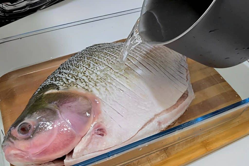 - Faça cortes paralelos superficiais em todo o peixe, dos dois lados.