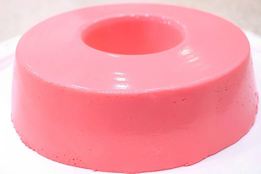 - Retire da geladeira, desenforme e sirva bem gelado esse lindo pudim de morango!
