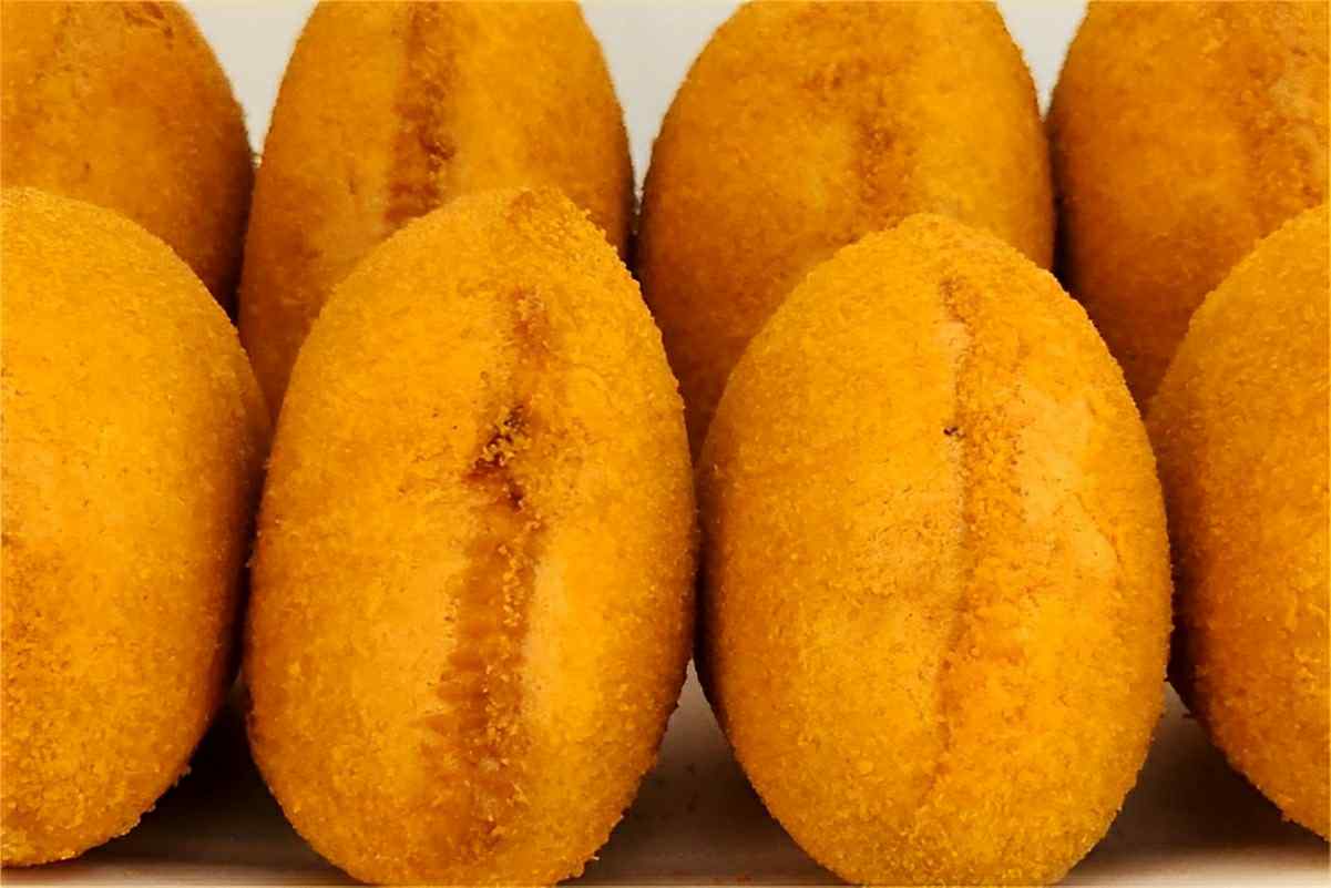 - Passe clara de ovo nos salgados com as mãos e empane na farinha de rosca, retirando o excesso e vá acomodando numa assadeira.