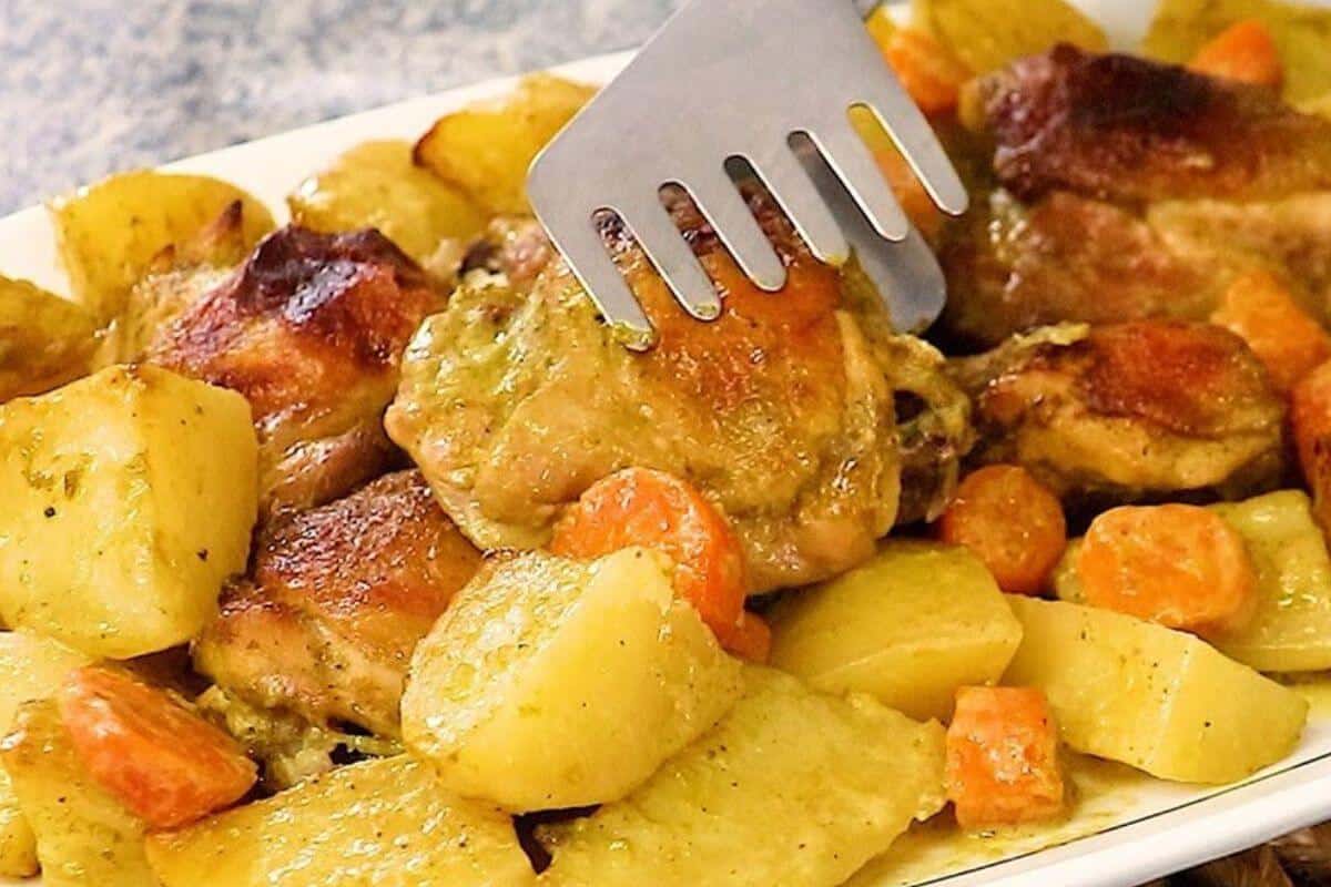 - Não coloque a batata ou a cenoura sobre o frango, arrume ao lado.