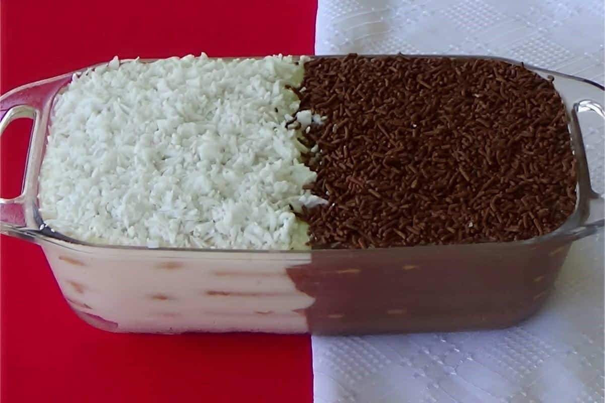 Para fazer sobremesa 2 amores iremos utilizar para o creme de coco, de leite, creme de leite, leite condensado, maisena e leite de coco. Para o creme de chocolate da sobremesa 2 amores vamos precisar de leite, leite condensado, creme de leite, chocolate em pó 50% cacau, maisena. Para a montagem da sobremesa 2 amores numa travessa, iremos utilizar biscoito maisena umedecido no leite. Teremos que seguir a sequência do passo a passo tanto do preparo dos cremes, quanto da montagem da sobremesa 2 amores na travessa. Depois disso iremos decorar com flocos de chocolate e coco ralado, gelar por 2-3 horas e saborear essa gostosura de sobremesa 2 amores!