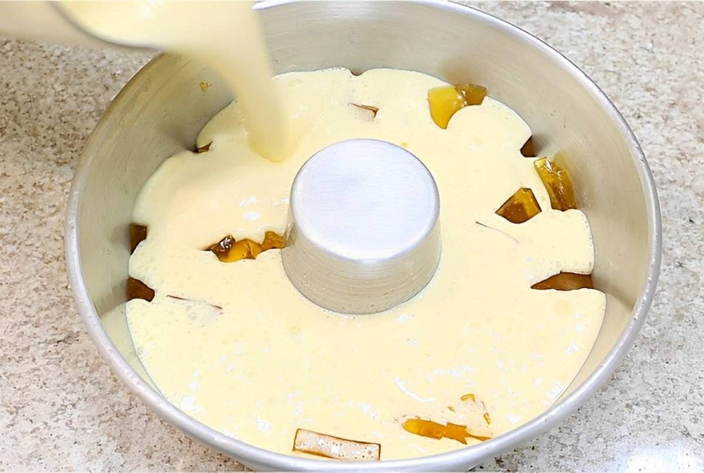 - Disponha no fundo de uma forma (23 cm de diâmetro) de furo central levemente untada com óleo.