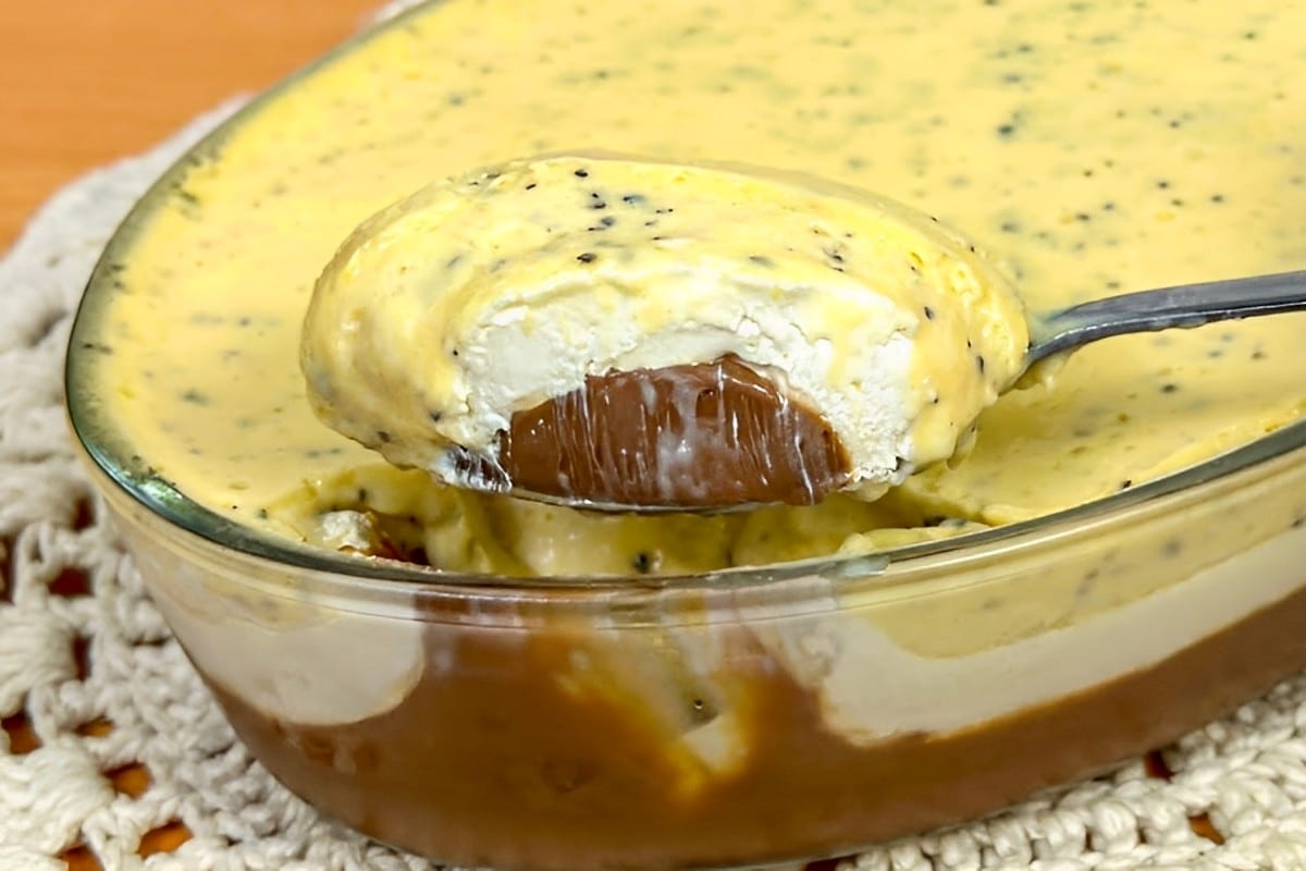 - Retire o refratário do freezer, e disponha a mousse de maracujá por cima da mousse de ninho.