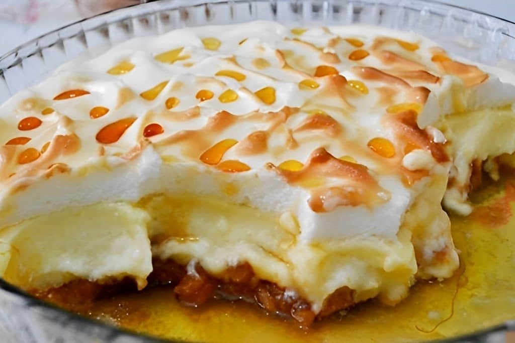 - Distribua esse suspiro sobre o creme e coloque em forno médio pré-aquecido até que doure levemente.