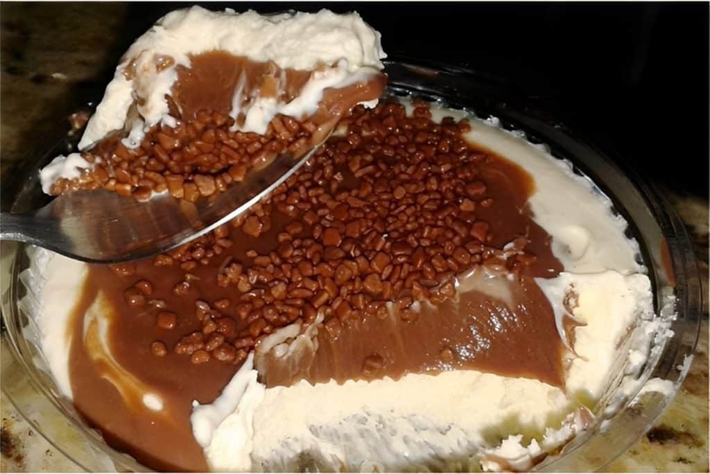 - Despeje por cima do creme gelado e polvilhe chocolate granulado (opcional).