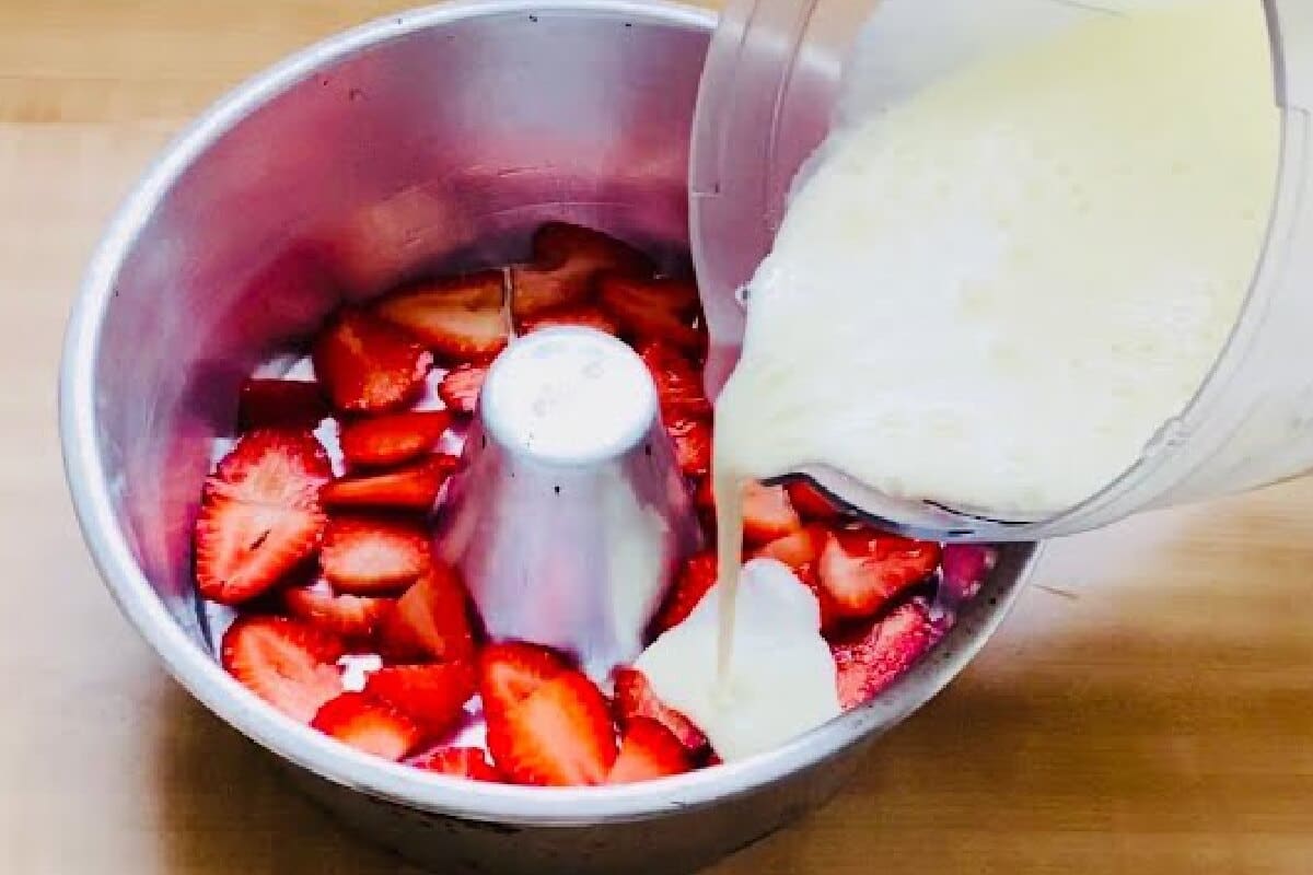 - Despeje, cuidadosamente, a mistura batida do liquidificador, por cima dos morangos.