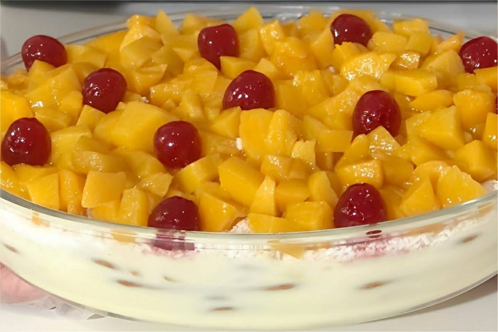 - Polvilhe com o coco ralado e coloque os cubinhos de pêssego por cima. Decore com cerejas em calda a gosto.