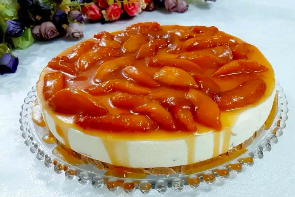 - Desenforme a torta e coloque em uma travessa de servir, decorando com a calda de pêssego.