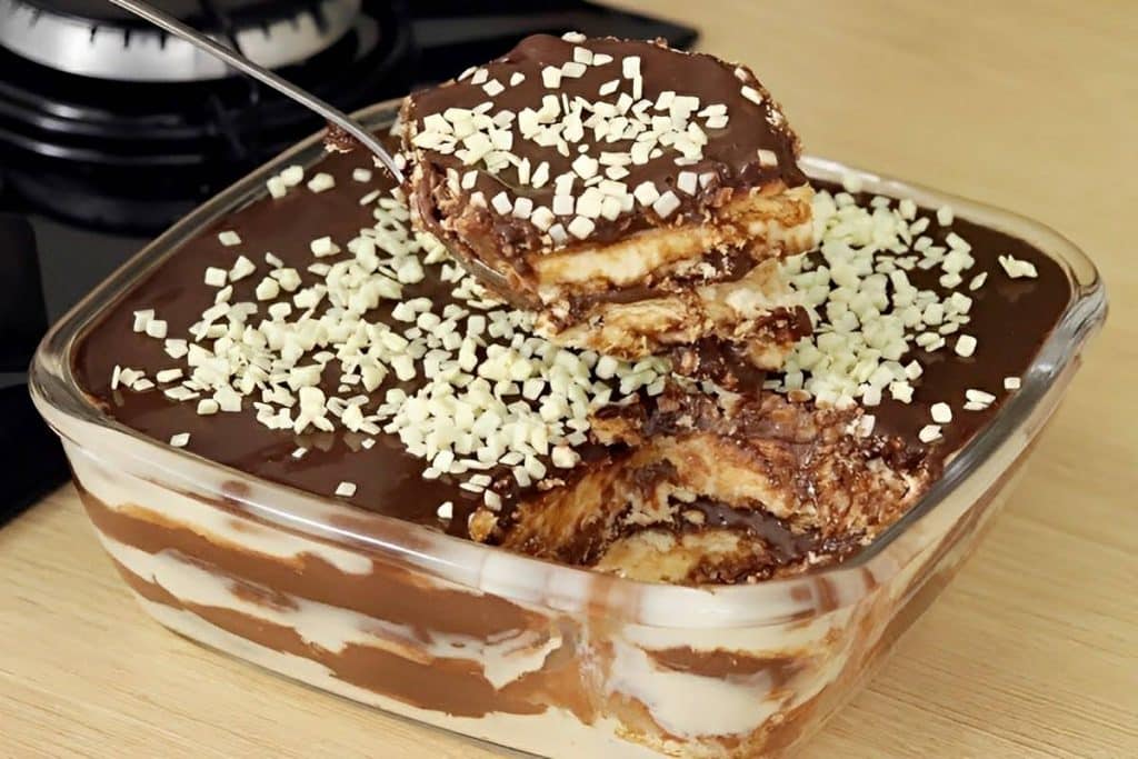 - Pegue uma travessa refratária de vidro e intercale camadas de mousse de limão, biscoito maisena e creme de chocolate até que os ingredientes terminem.