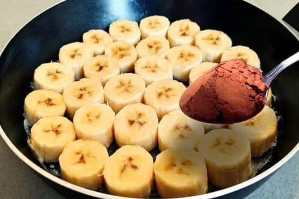 - Disponha todas as rodelas de banana na frigideira, preenchendo toda a extensão – uma ao lado da outra.