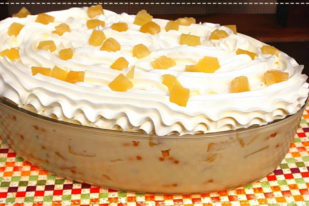 - Leve para gelar por 3 horas. Retire da geladeira, cubra com o chantilly e decore com cubinhos de abacaxi cozido.